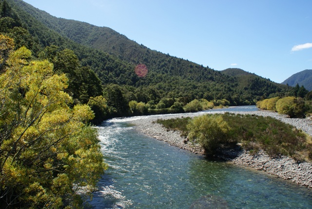 Ross joined us again for the start of our trip south – another spectacular day. Our destination was Hanmer Springs after crossing the Southern Alps over Lewis Pass. But the getting there will go down as perhaps the  most scenic ride I have ever done. The beauty of the landscapes we encountered was intoxicating and every bend revealed a new scene. From Nelson we followed State Highway 6 south to the village of Wakefield and turned to follow the Golden Downs Road to the Nelson Lakes District.  This road winds its way through exotic (trees not native to NZ) forests which cover the mountains and valleys and by the time you get to St Arnaud, you are truly in Alpine country. St Arnaud is a chalet village at the edge of Lake Rotoiti, a glacial lake surrounded by native Beech forest. Actually saying Lake Rotoiti is a redundancy as in the Maori language, Roto means lake and Iti means small. Apart from the insects which are attracted to human blood, there is a very calm environment with deep blue clear lake water, rich native bush forest and as a backdrop, the northern end of the Southern Alps trying to show the first snows of Autumn. The only sound is bellbirds, tuis and other birds singing in the forest. From here we started to follow the Buller River as is works its way to the West Coast, a truly spectacular landscape. We turned off SH to see Lake Rotoroa which has very little settlement and what you see is no doubt the same as the first Maori explorers saw a thousand years ago. This is where Ross was to turn back home to Nelson and we said our good-byes and continued towards Murchison for lunch. Murchison has become an adventure town providing canoeing, riding and other activities for those not dressed in motorcycle gear. No far from there, we turned south onto SH65 through the Maruia River valley.
