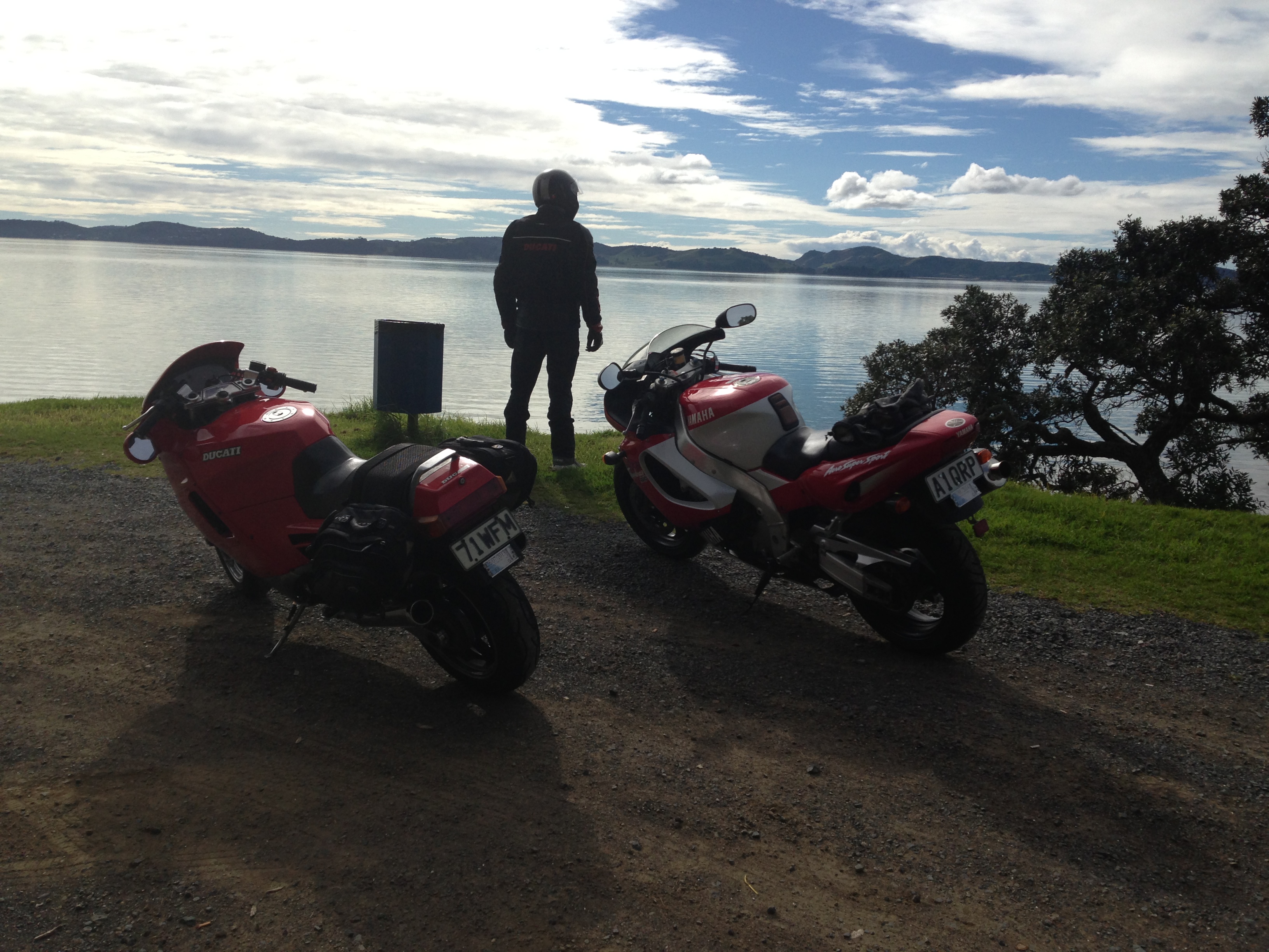 Just a short Sunday morning ride after a catch up with Jono and Justin. Jono has sold his Tenere and replaced it with two bikes – a Ducati 750 sport and a Yamaha YZF 1000 Thunderace. The Ducati is immaculate and the Yamaha is good to go, also in great condition. I had to drive to Justin’s place as my BMW K1200’s battery was flat, and Jono let me ride the Yamaha. We met at the Maraetai Wharf Cafe as usual for a coffee at the beach side. Justin and I then rode the Clevedon Loop. I was impressed with the Yamaha, plenty of power and neutral handling.