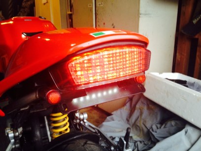 I replaced the stock tail light with an LED one from ducatimonstertailchop.com in the USA, which incorporates the indicators, as well as the license plate illumination. A new tail tidy from the same supplier finishes off the tail chop nicely. I also ordered some random reflective licence plate fasteners to take care of the LTSA regulations for reflectors, but when they turned up, they were way too big for my number plate, but perfect as tubular end plugs for my tail chop. LTSA regulations are now dealt with and I think they look quite snazzy.
