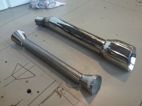 It is time to view my tacked-up Andreani custom exhaust mufflers. Hopefully the removable baffles (for changing muffler packing of course) will do their job without drawing too much attention from the law.